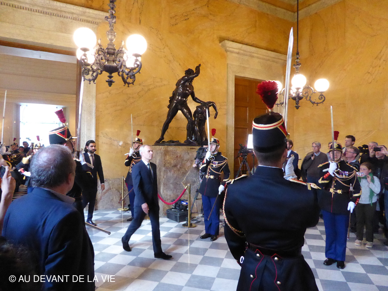 L'horaire de notre visite nous a permis d'assister à l'arrivée du Président de séance se rendant dans l'Hémicycle en traversant la Salle des Quatres Colonnes au milieu d'une haie d'honneur constituée de gardes républicains accompagnés par les célèbres roulements de tambour.
