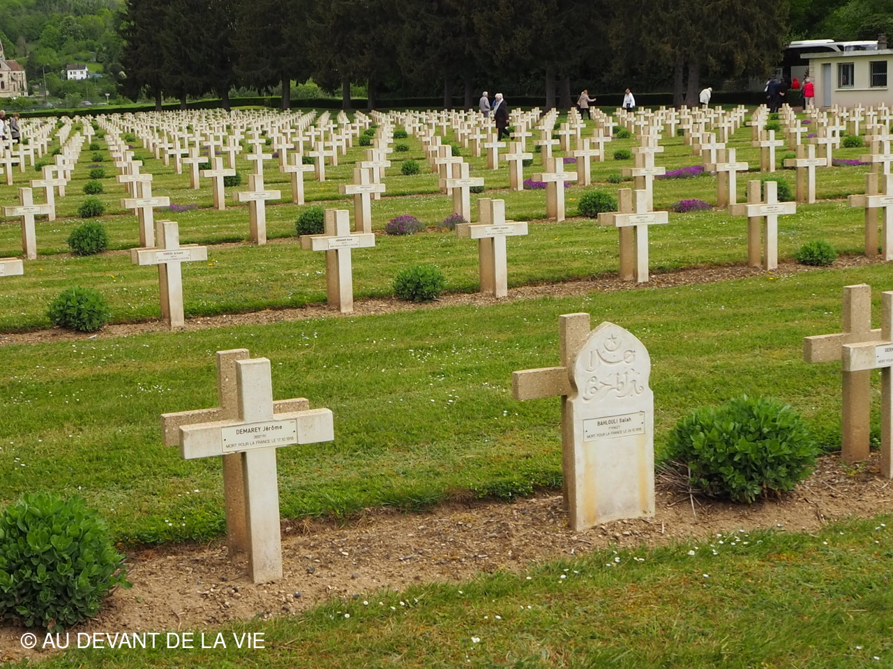 Arret au cimetière de SOUPIR Le territoire communal de Soupir accueille les deux nécropoles nationales de Soupir créées à partir de 1920 afin de rassembler les corps des fosses collectives d'Athies-sous-Laon, Gellnes, Pargny-Filain, Vieil-Arcy, soldats Morts pour la France à l'automne 1914, en avril 1917 et en octobre 1918. Il abrite 7 808 corps dont 4 720 en tombes individuelles et collectives et 3 088 dans les 3 ossuaires, ainsi que quatre fosses collectives regroupant 266 corps qui proviennent des sites de Vieil-Arcy, Athies-sous-Laon, Glennes et Pargny-Filain. S'y trouve aussi la tombe d'un soldat belge et celle d'un combattant russe.
