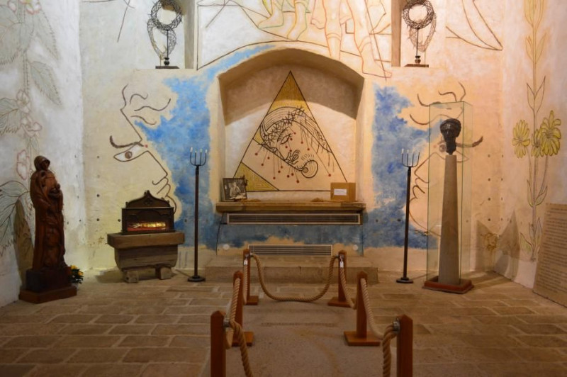Jean Cocteau en décora intégralement l'intérieur en 1958, dans un style naïf et touchant, s'inspirant des simples pour réaliser les grandes fresques murales (jusquiame, belladone, valériane, guimauve, arnica, renoncule, colchique et aconit).