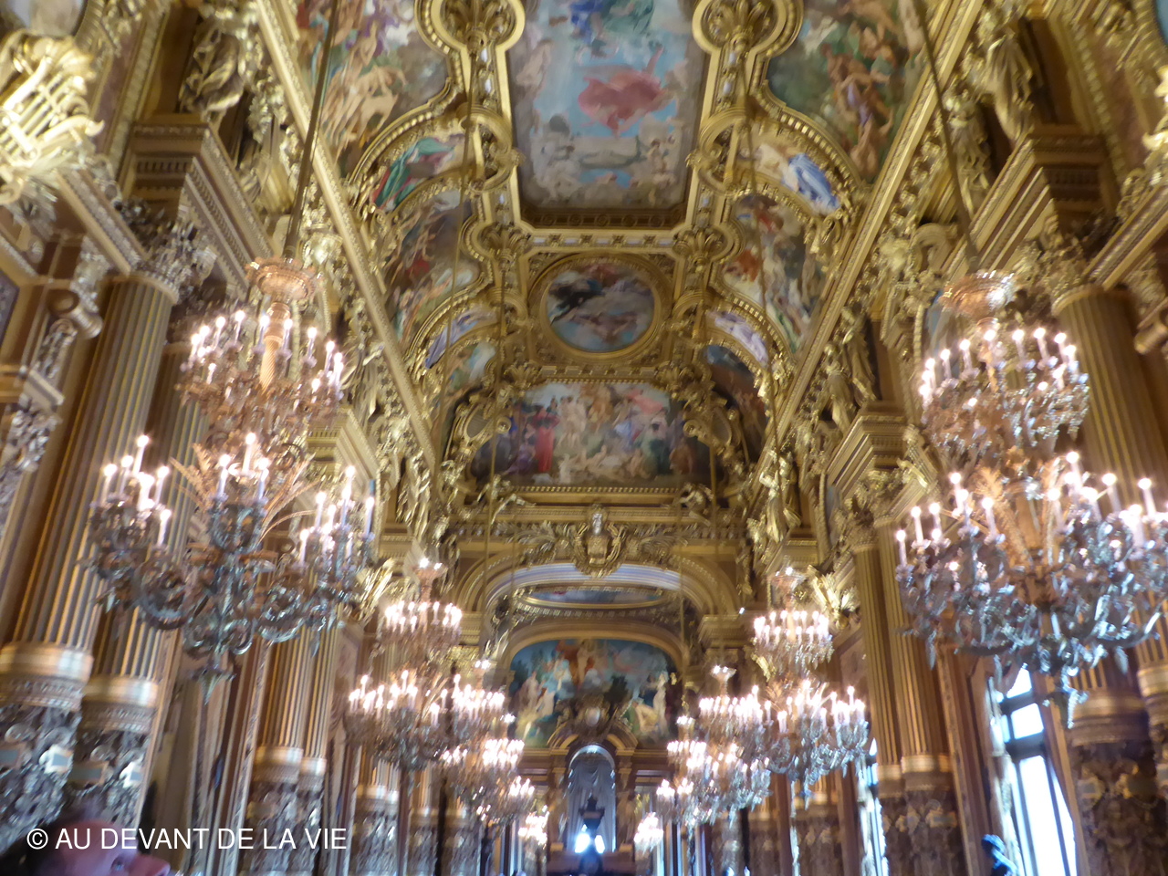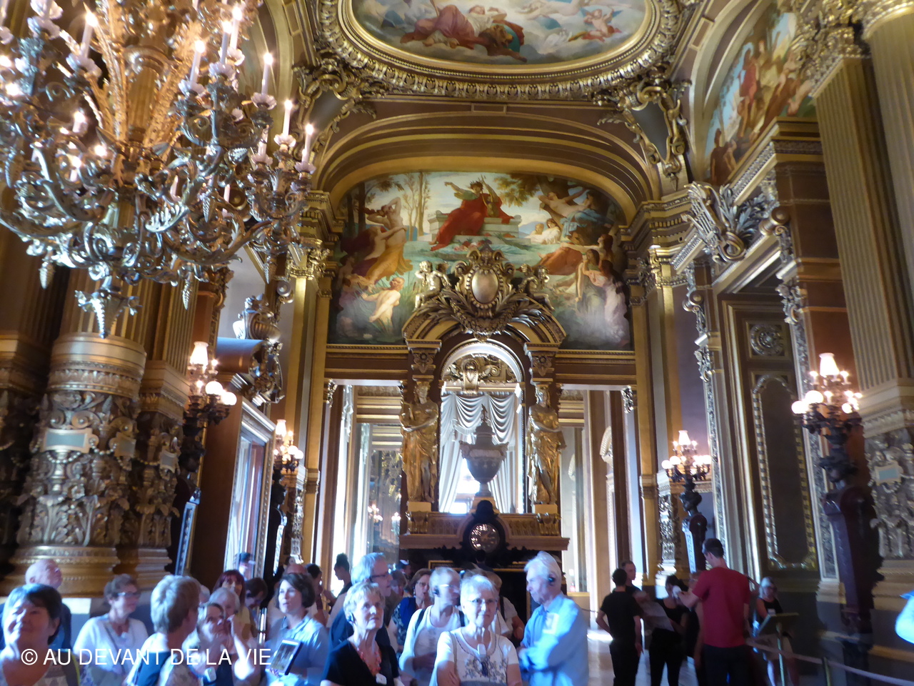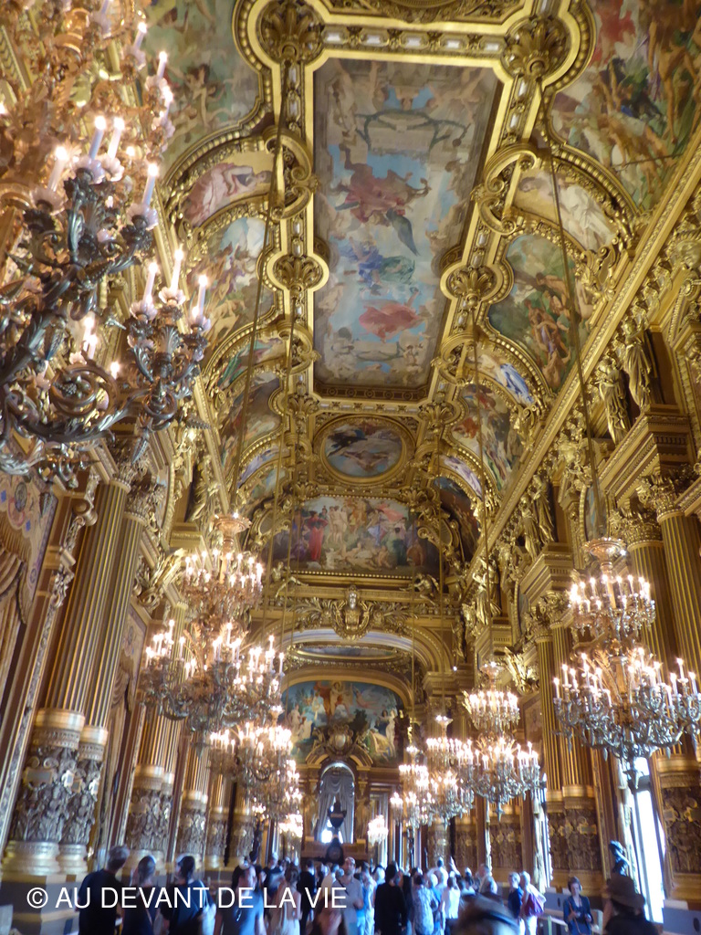 Ce plafond évoque de grands compositeurs d'opéra dans un univers étrange, peuplé de leurs personnages. Notre visite se poursuivit après être passés par la bibliothèque vers le Grand foyer. Ce lieu majestueux orné de miroirs et de grandes baies vitrées, qui ouvre l’espace sur l’avenue de l’Opéra .