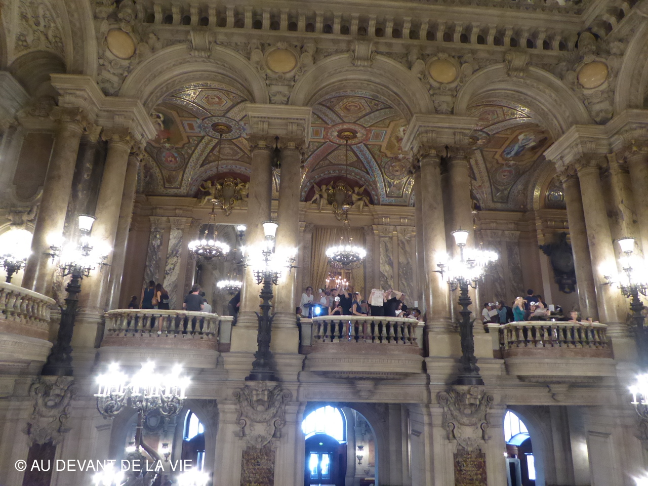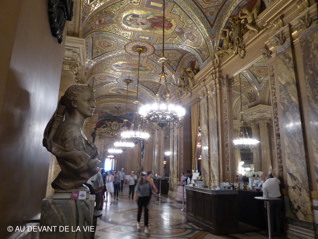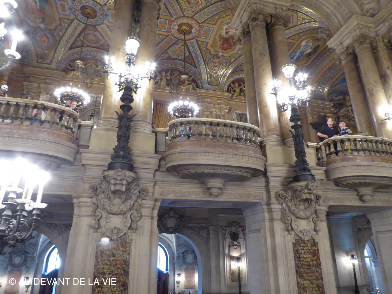 Ce plafond évoque de grands compositeurs d'opéra dans un univers étrange, peuplé de leurs personnages. Notre visite se poursuivit après être passés par la bibliothèque vers le Grand foyer. Ce lieu majestueux orné de miroirs et de grandes baies vitrées, qui ouvre l’espace sur l’avenue de l’Opéra .