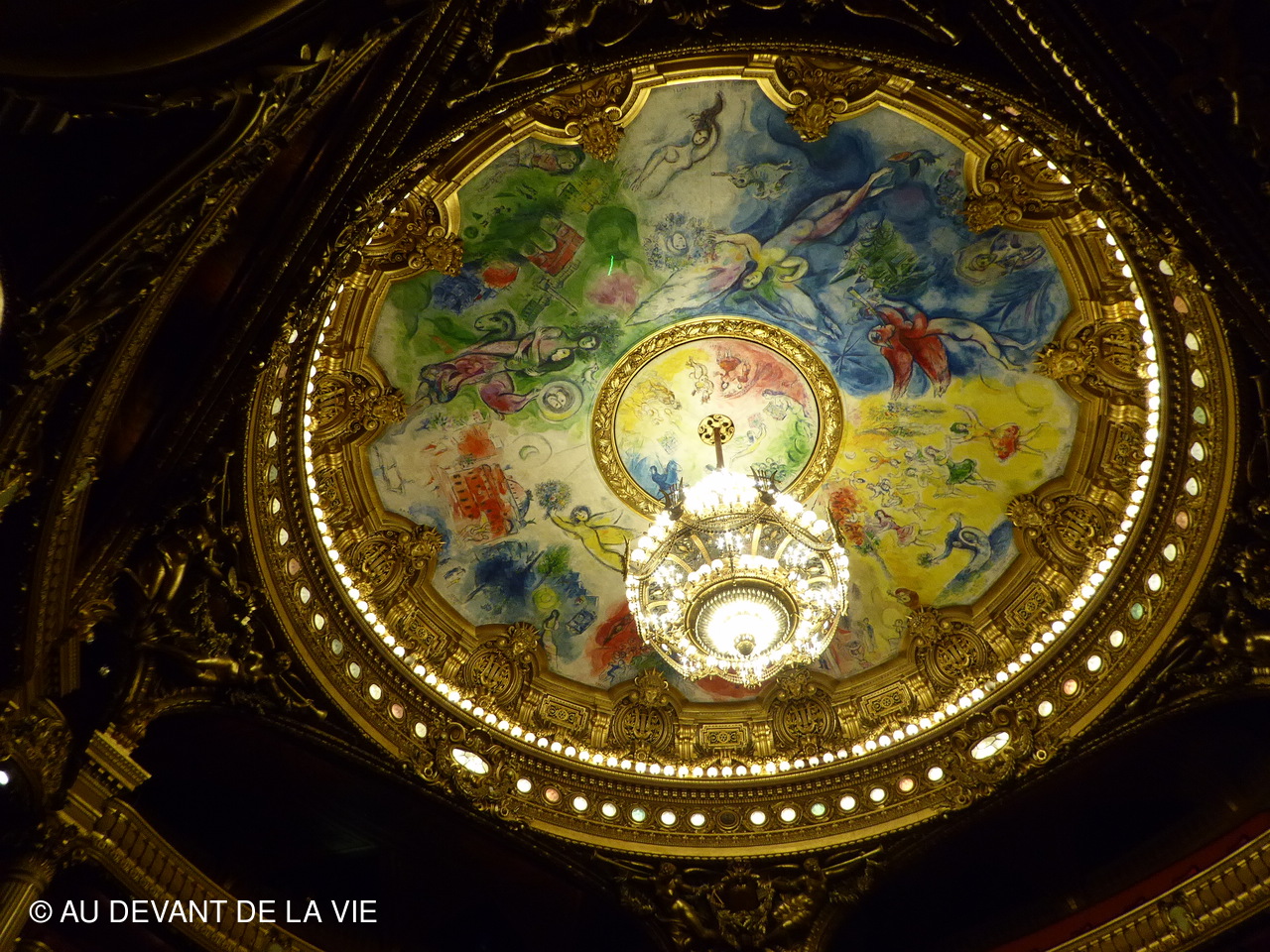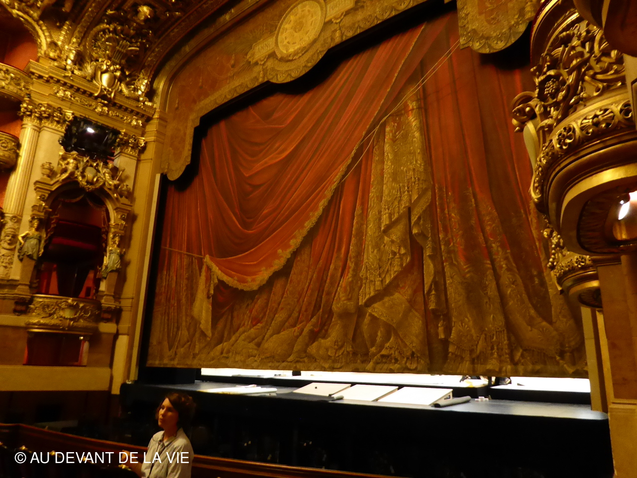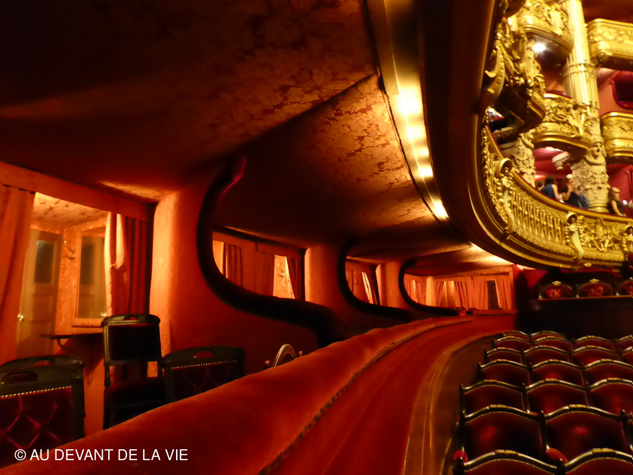 Passage dans la grande salle pour y admirer les fauteuils d’orchestre, les loges et baignoires, la fosse d’orchestre ainsi que le plafond peint par Chagall en 1960.