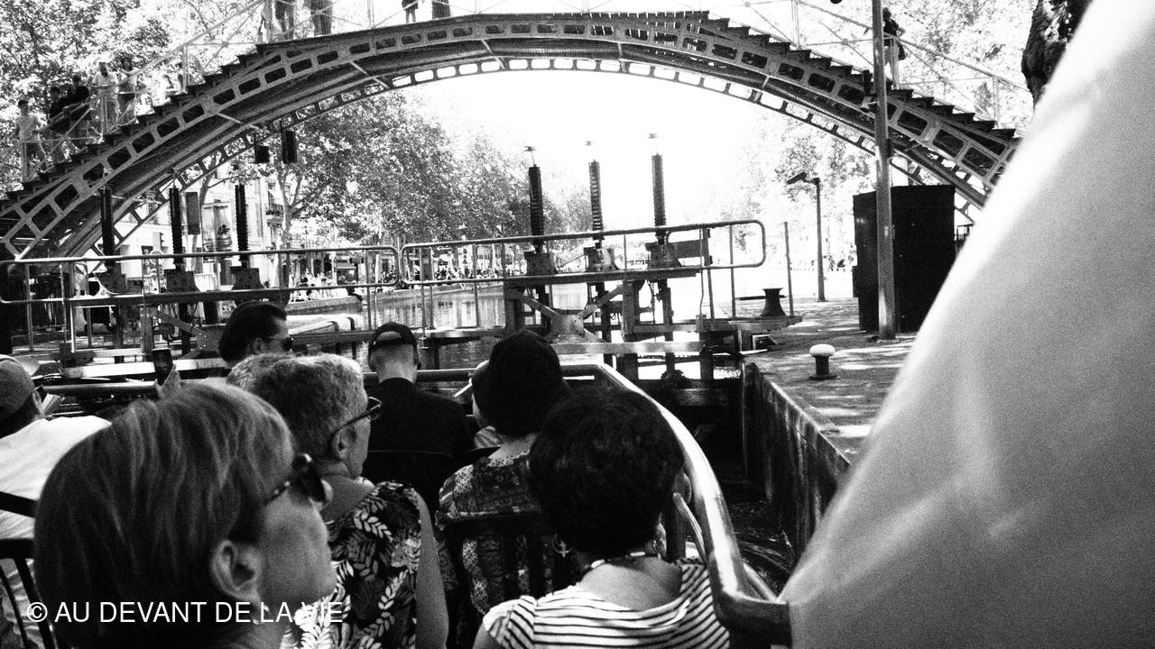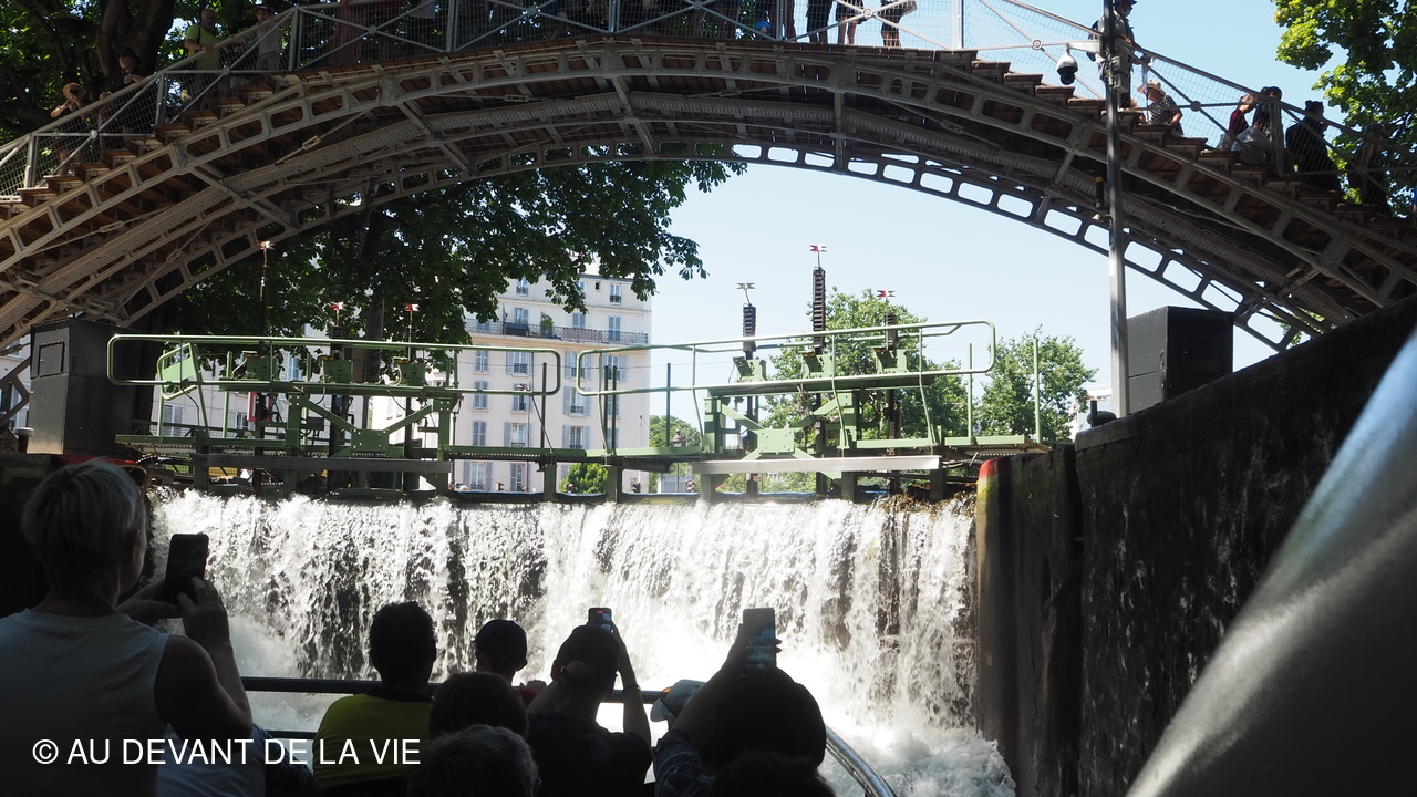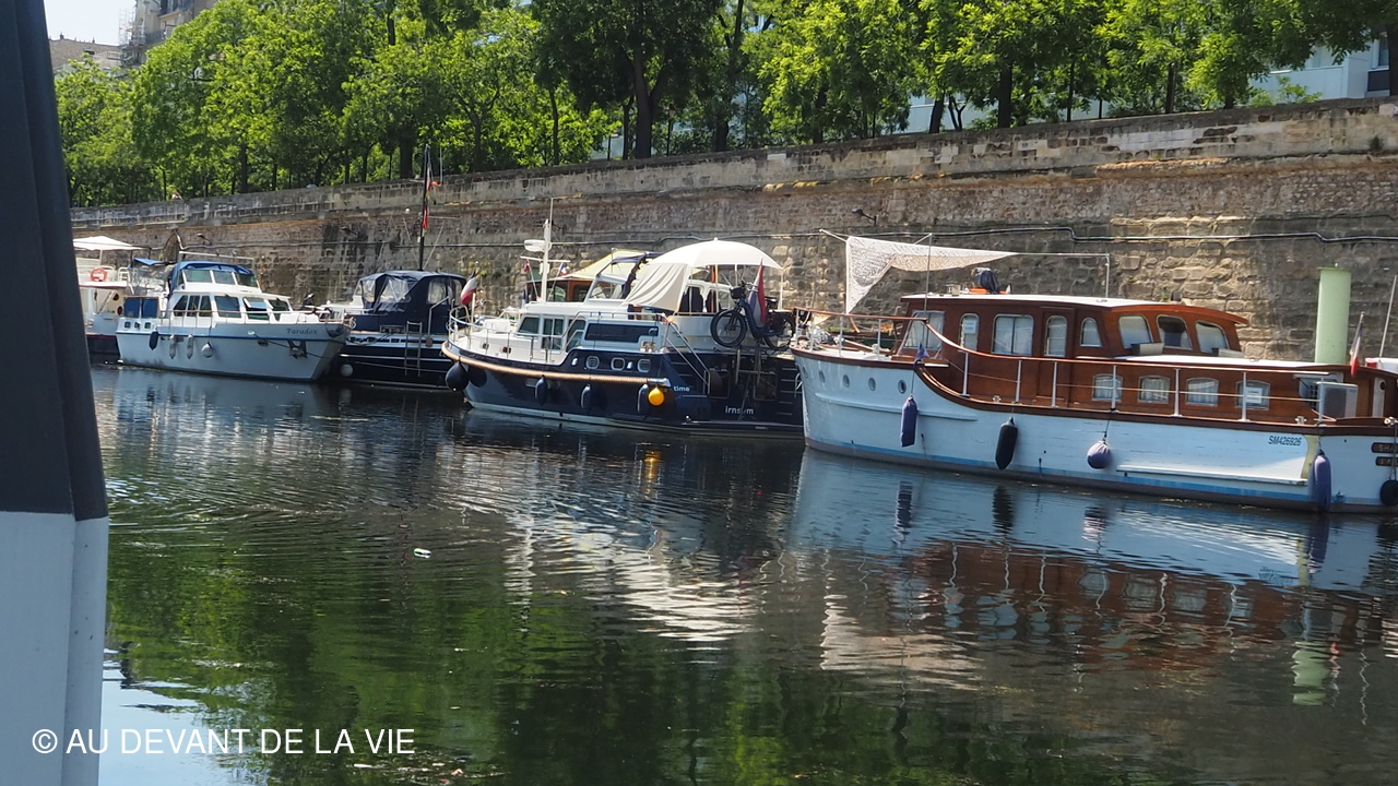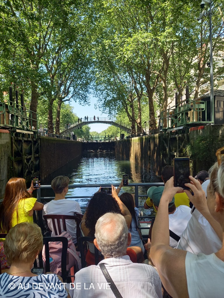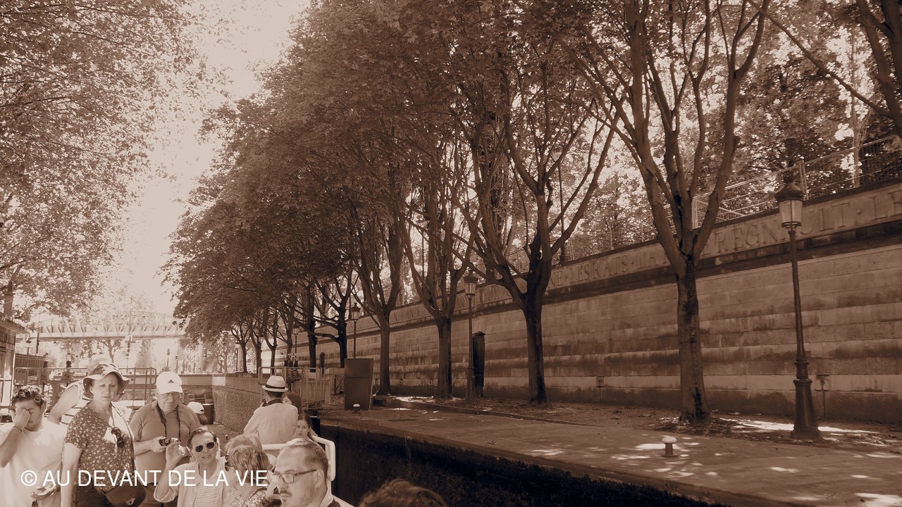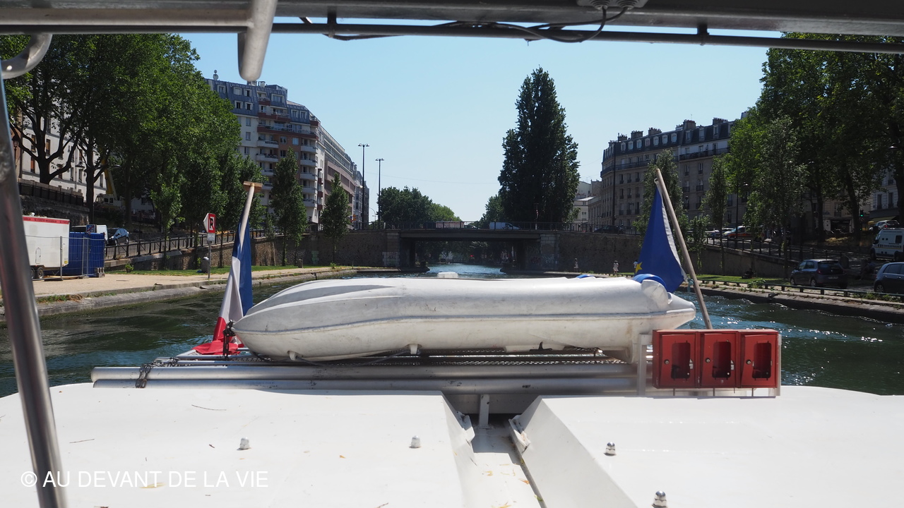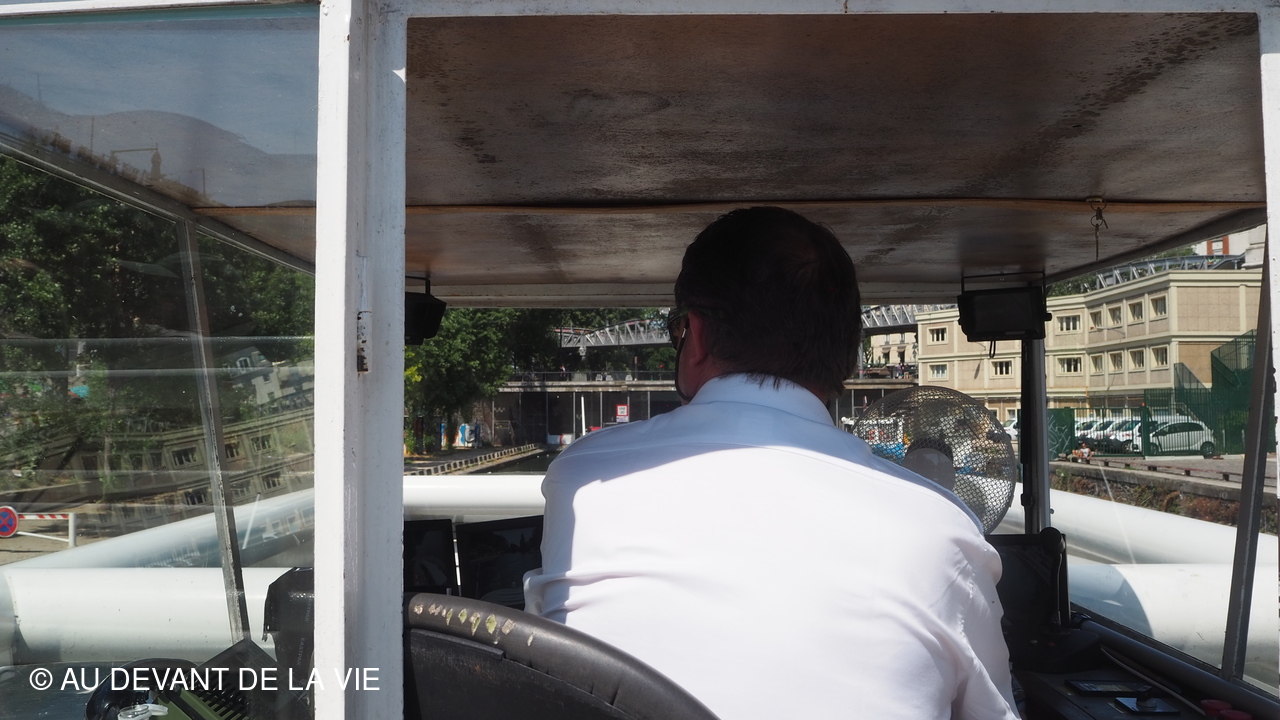 Pendant plus de 2h30 de navigation et aprés avoir passé plusieurs écluses la traversée de Paris du sud vers le nord nous a conduits au Bassin de La Villette et à à l'entrée du Canal de l' Ourcq.