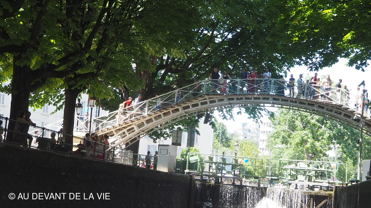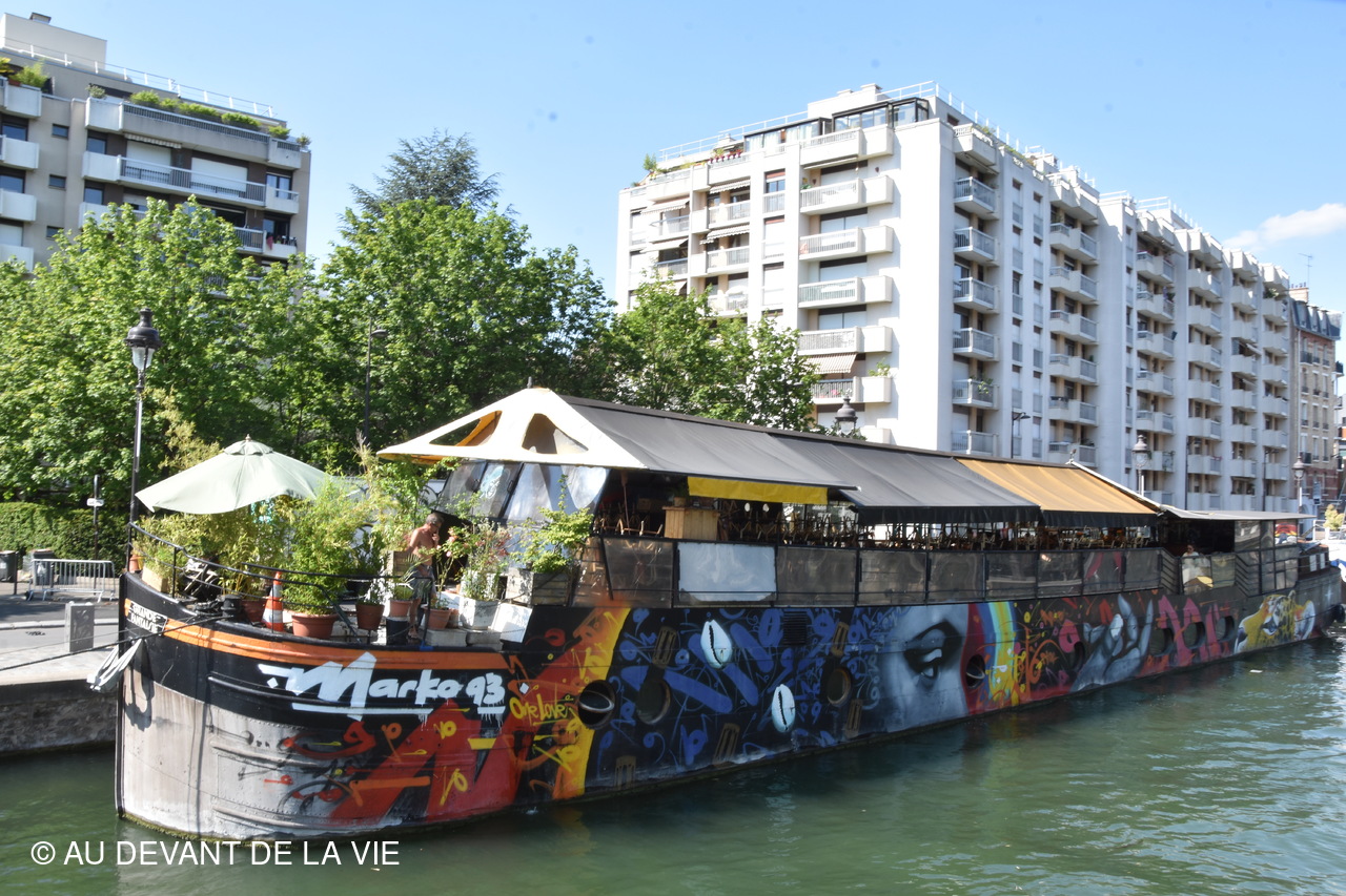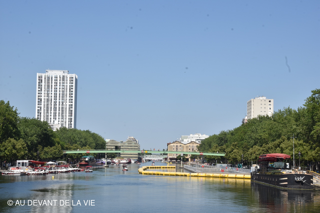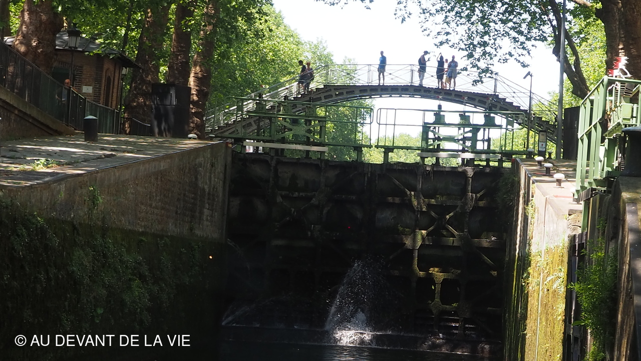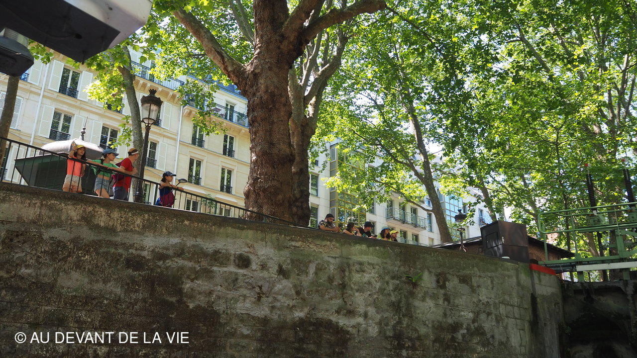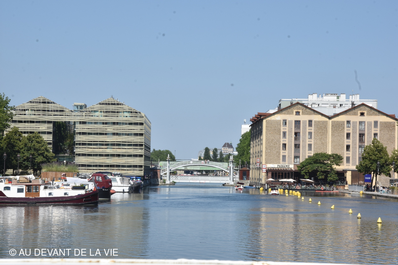 Pendant plus de 2h30 de navigation et aprés avoir passé plusieurs écluses la traversée de Paris du sud vers le nord nous a conduits au Bassin de La Villette et à à l'entrée du Canal de l' Ourcq.