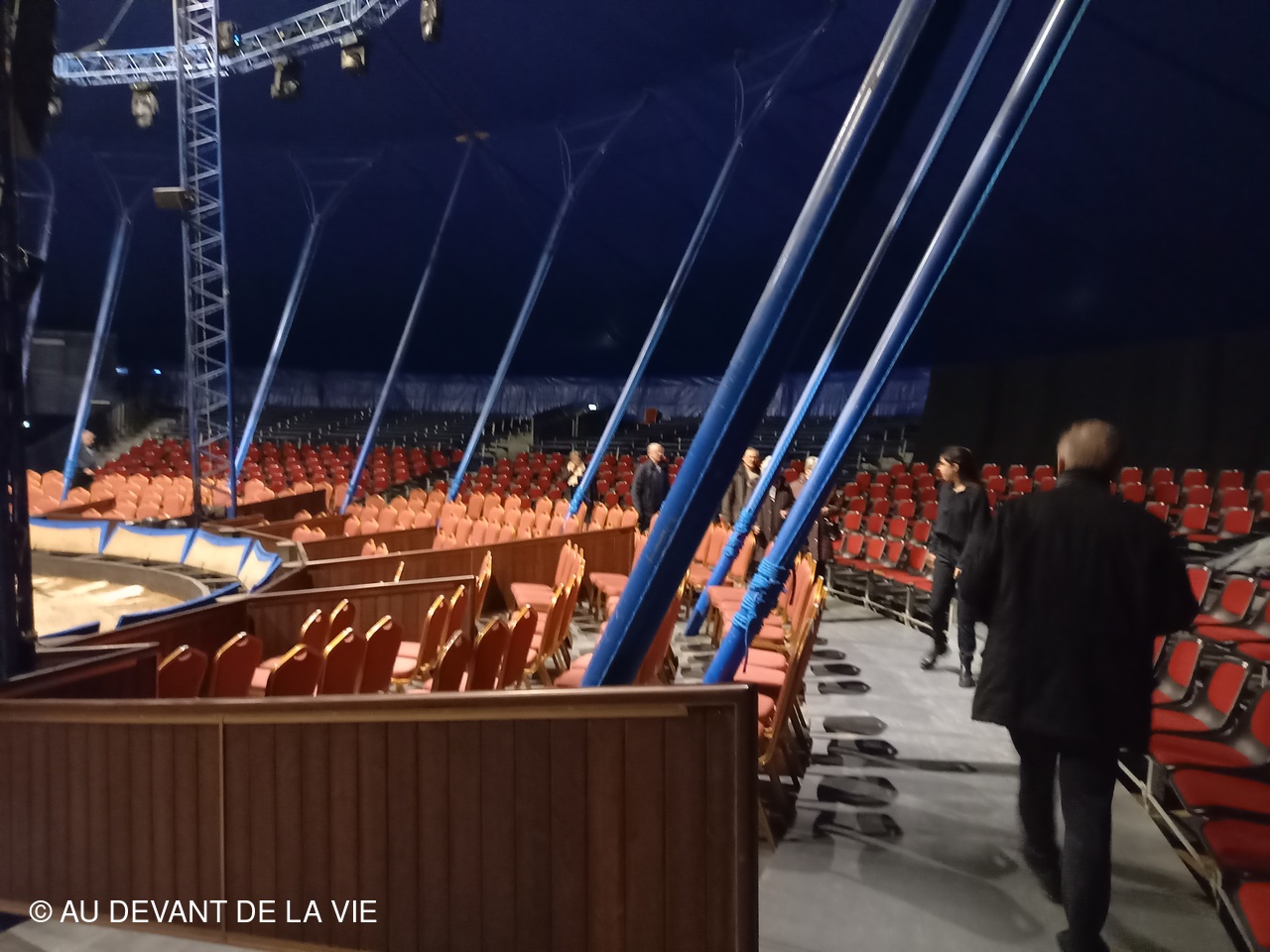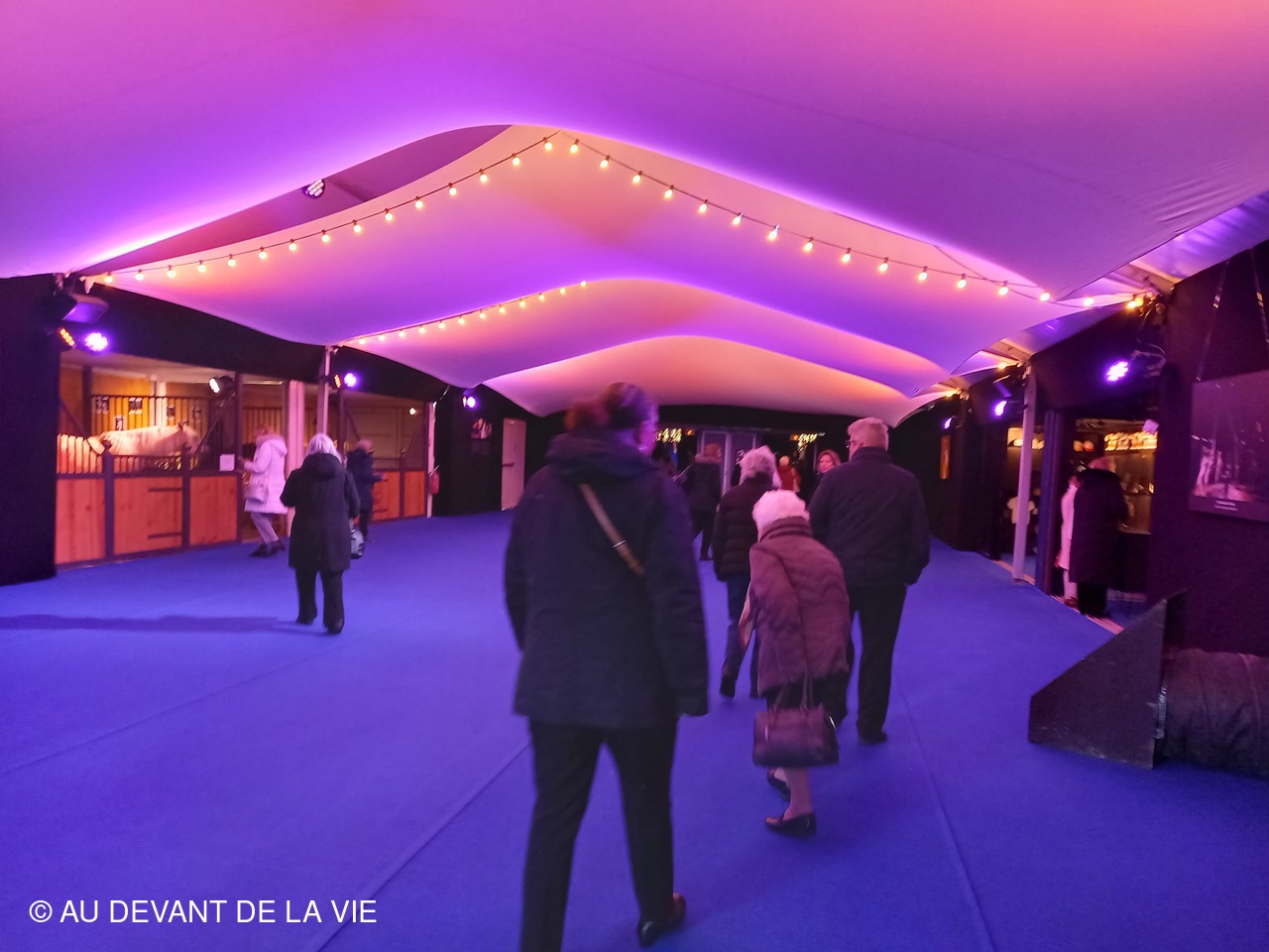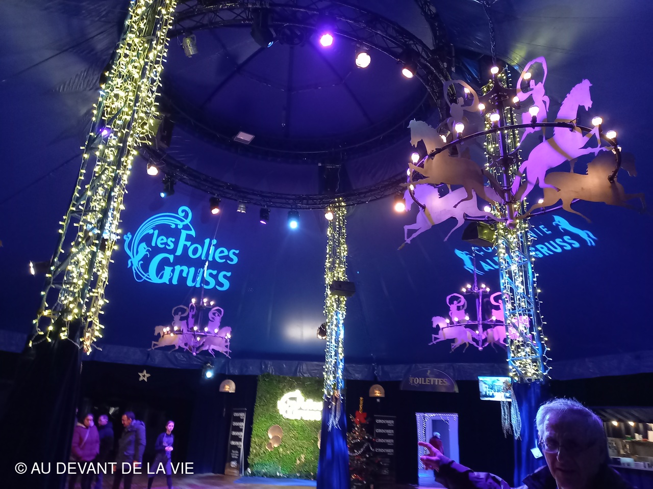 A notre arrivée, acueillis par des membres de la famille Gruss et compte tenu de notre arrivée prématurée nous avons été conviés à nous diriger vers les box dans lesquels les chevaux attendaient patiemment le moment d'entrer en piste . Dans un chapiteau annexe merveilleusemnt décoré de ses lumières de fêtes et avec la présence de musiciens et d'artistes du cirque , un excellent repas de NOËL nous a été servi. Coupe de champagne , huitres , foie gras etc. et une délicieuse bûche de Noël pour terminer.